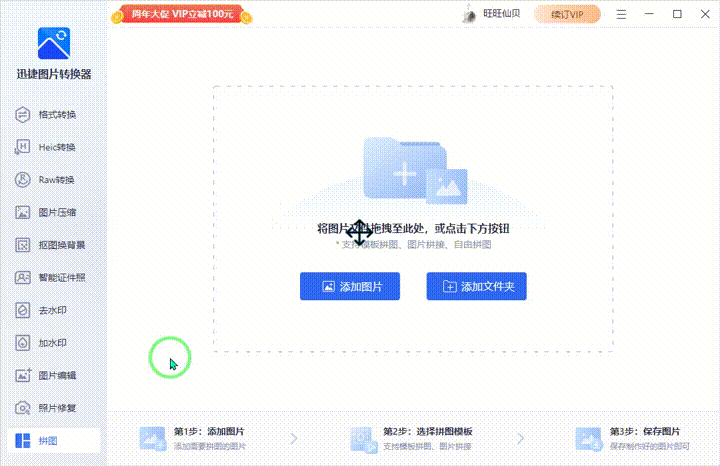 这是一款电脑端的图片处理工具,软件内包含了格式转换、图片压缩、抠图换背景、去水印、照片修复和拼图等多个实用功能,接下来就为大家展示几个常用的功能效果吧!