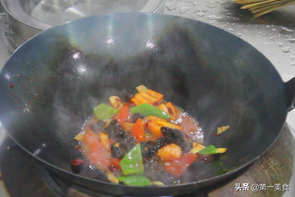 锅里留油,油热后,倒入葱姜蒜爆香,再放入红干椒,翻炒几下,倒入配菜后继续翻炒。