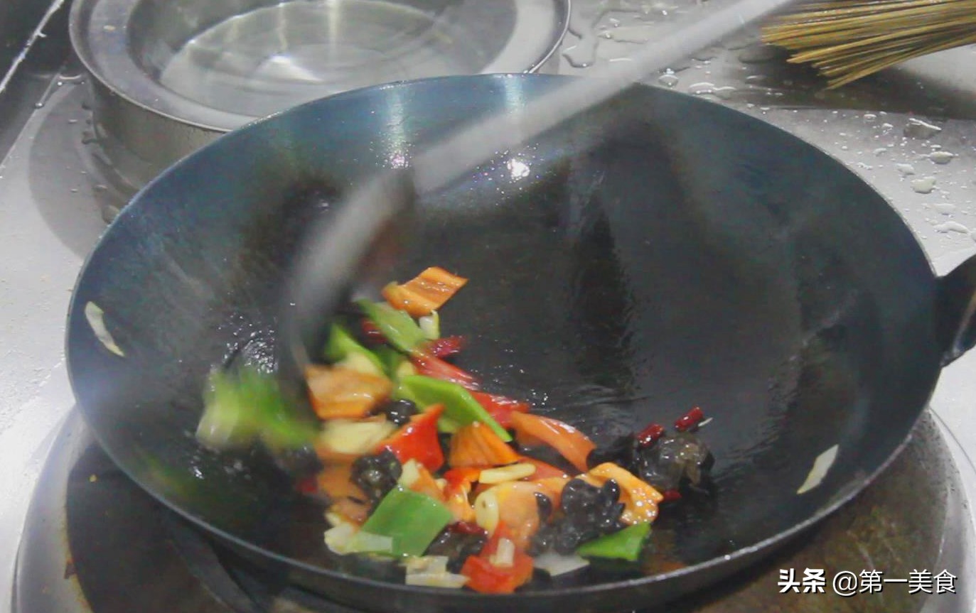 青椒、红椒切成菱形片,这样配色好看。西红柿半个,去蒂切成斜刀,木耳泡发后摘去根部,随便切上两刀,然后放在一起备用。