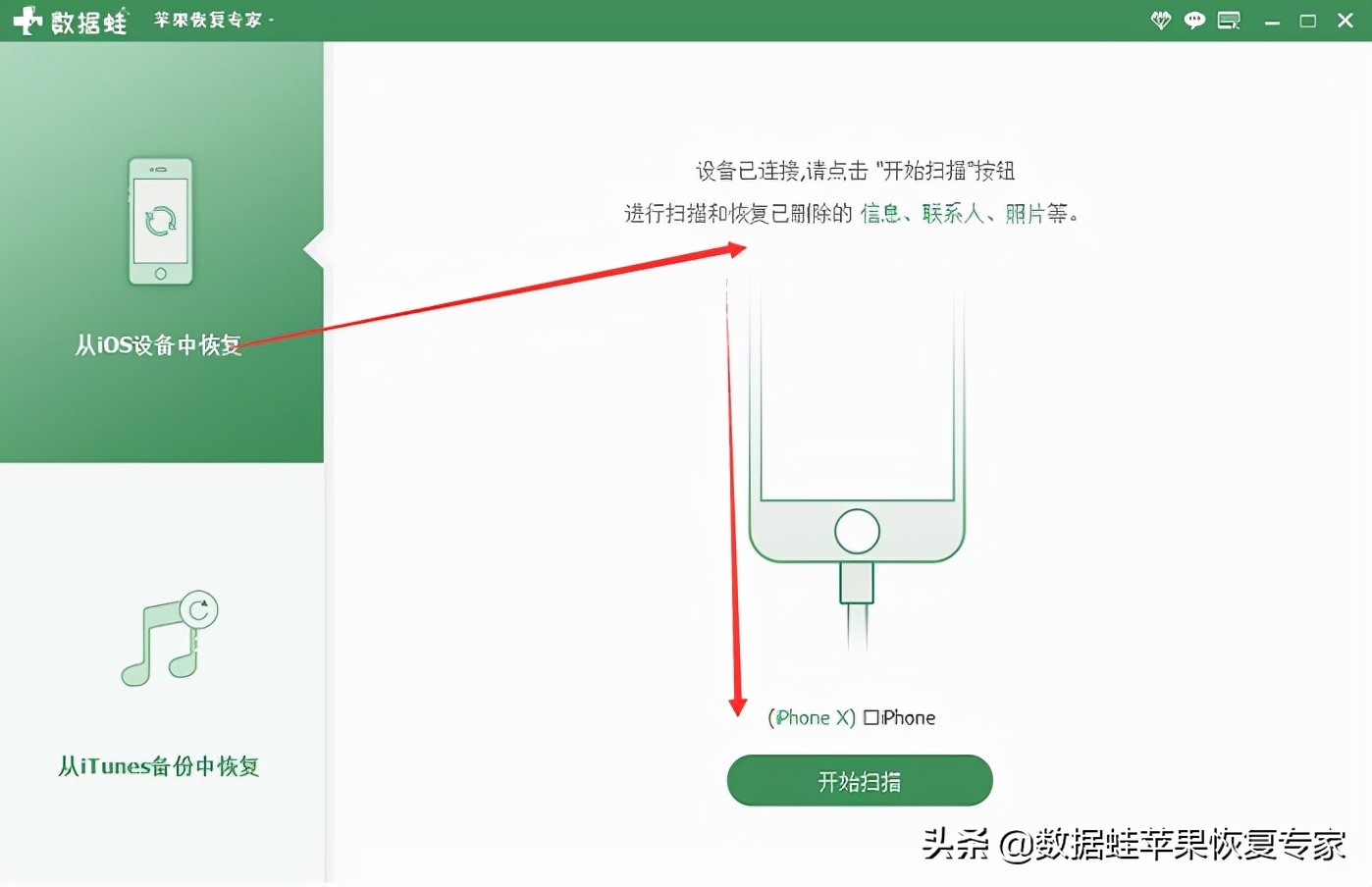 安装这款软件到您的常用电脑上,并连接好手机,一切准备就绪,打开软件,选择“从iOS设备中恢复”,并点击“开始扫描”。