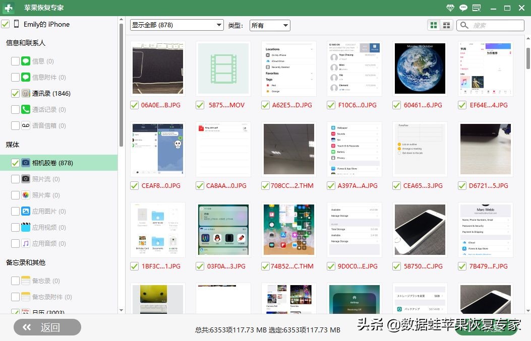 扫描完成后,点击左侧的“相机胶卷”,页面的右边将会显示出全部数据正常的照片,红色字符的为已删除的照片,黑色字符的为正常照片,只需要选出需要恢复的照片,最后点击“恢复”即可。