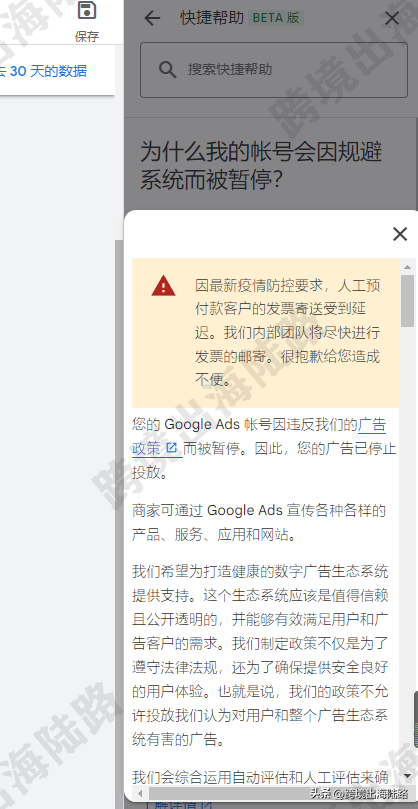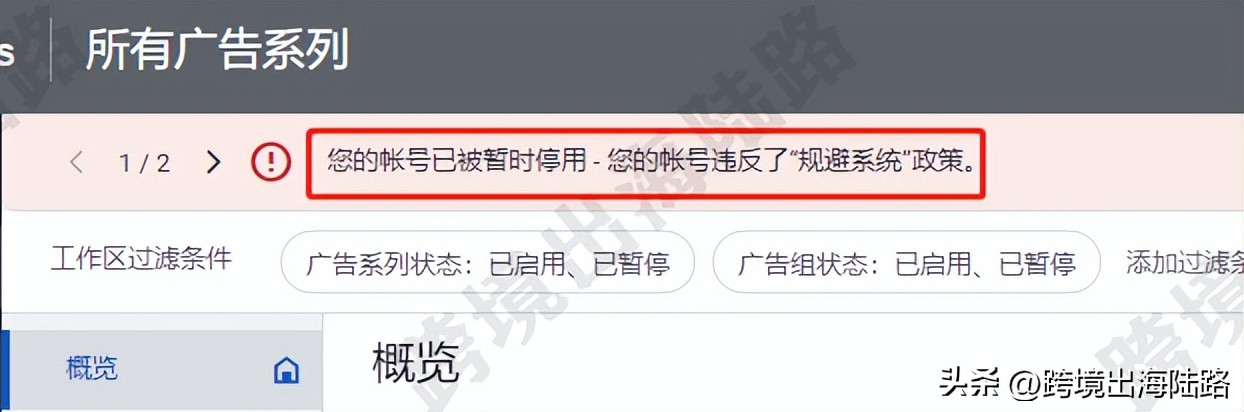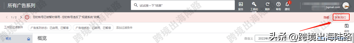 2.广告账户显示您的账户已被暂时停用。需要根据后面的理由,了解政策进行网站修改和申诉信材料准备。可联系博主要《网站自查清单》和《申诉材料要求》