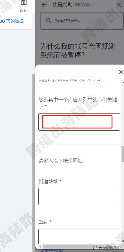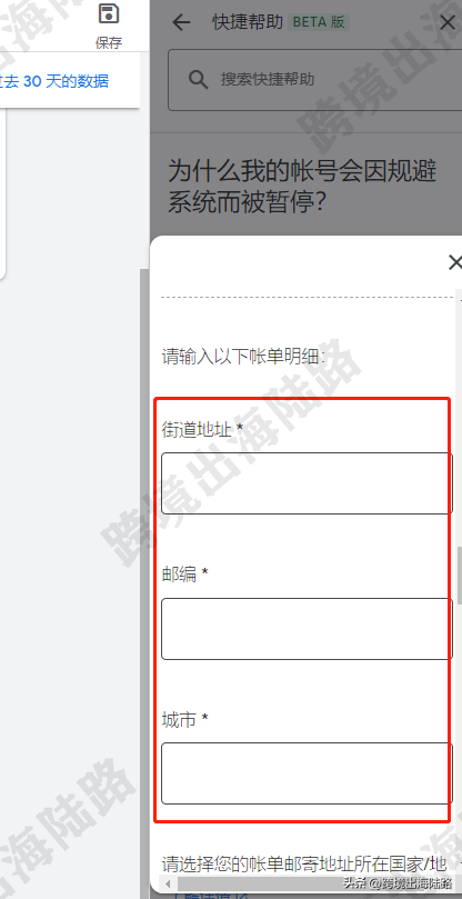 9.输入账单明细(街道、邮编、城市)。可在谷歌广告账户点击>工具和设置>在结算下>点击设置>可查看以下所需要用到的信息