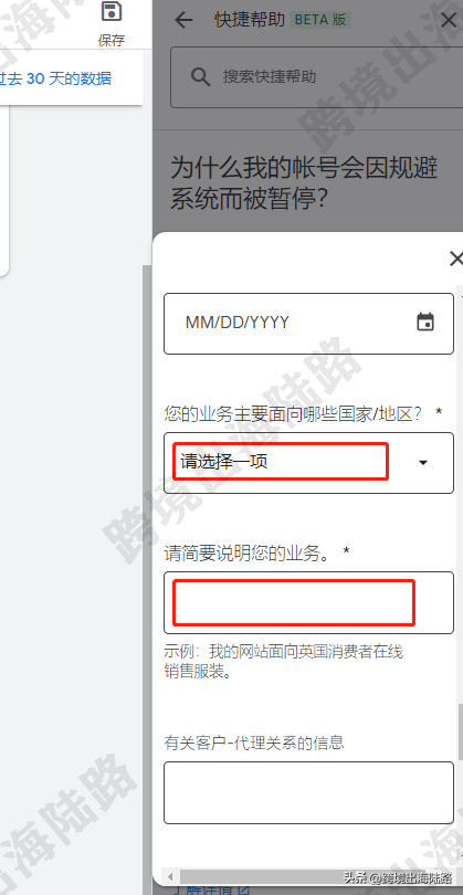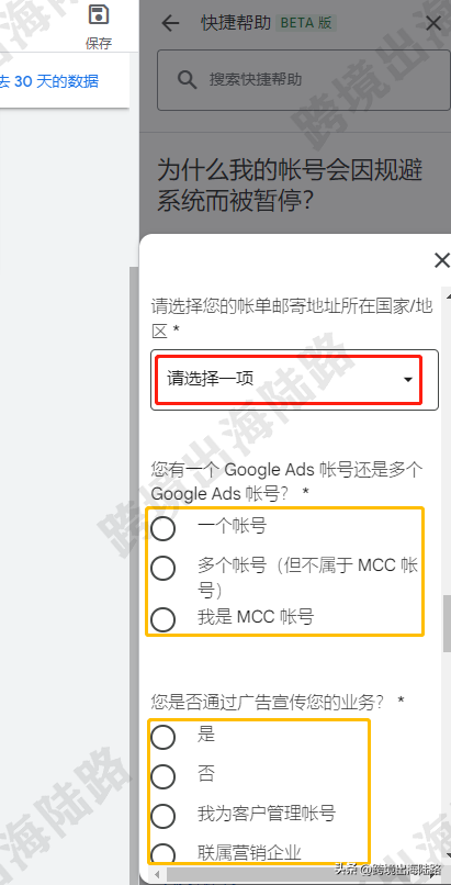 10.选择账单邮寄地址所在国家/地区。选择对应的账户数量情况和广告宣传业务调查