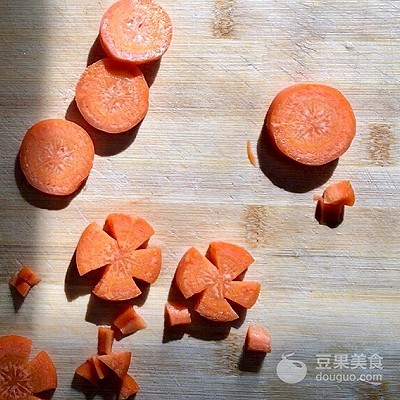 4、胡萝卜去皮切成片,可以根据自己的喜好切出花型。(也可以不切花型,胡萝卜切的在两公分到三公分的厚度左右,因为煮的时间比较久,切的太薄容易软烂)