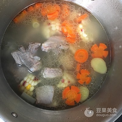 6、排骨煮30分钟后把切好的玉米和胡萝卜全部放入锅中,继续煮20至30分钟。(具体煮多久要看排骨的大小和玉米的鲜嫩有关,如果排骨比较粗肉厚煮的时间久一点,玉米尽量不要选太嫩或者太老的,太嫩煮了玉米粒容易瘪,太老的口感差,买的时候最好扒开玉米皮挑一挑)