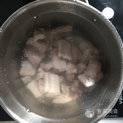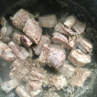 1、排骨放烧开的水里过一下水,把排骨里的血沫冒出来,然后捞出排骨洗干净。