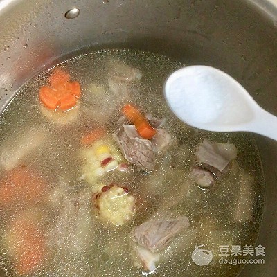 7、关火前10至15分钟左右加入适量的盐,搅拌一下,让盐在汤里混合均匀,过十几分钟关火就可以了。汤里的油脂可以在关火后用勺子撇出来,根据个人需求。