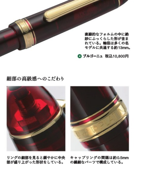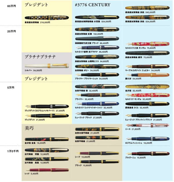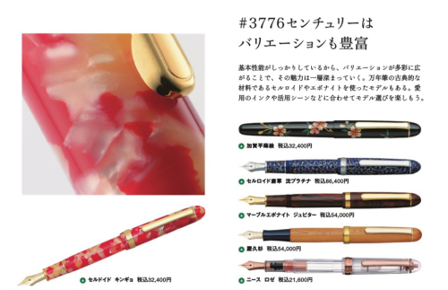 3776世纪系列:3776世纪系列从基础的教堂蓝、酒红;镀铑款;中端的尼斯系列、象嵌、赛璐珞、金箔、木杆等换壳款;高端的莳绘款、唐草款等。产品线从一万日元覆盖到了50万日元以上,是白金最核心的系列钢笔。