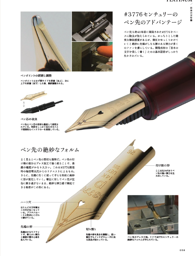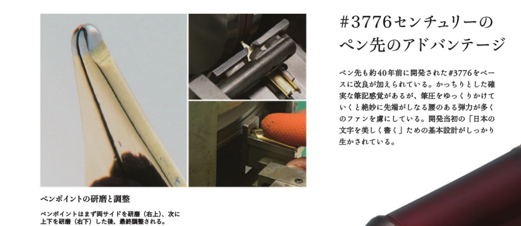 笔尖是以40年前款式#3776的笔尖为基础,经过改良研制而成,整体书写感受非常硬朗,但也有不错的弹性,这样的硬弹触纸感,折服了大量消费者。3776世纪系列彻底达成了【书写漂亮的日语】这个设计目标。