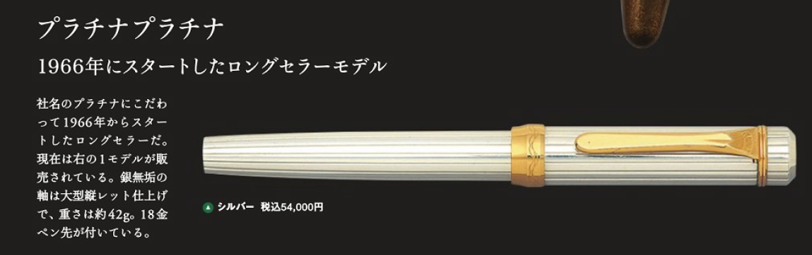 型号为【Platinum Platinum】的钢笔,在1966年就首次推出,作为和会社名称一样的款式,白金始终对这款产品高度重视。目前销售的款式采用条纹银工艺,重量达到了42g,白金也为其定制了一款18K金尖搭配这款钢笔。