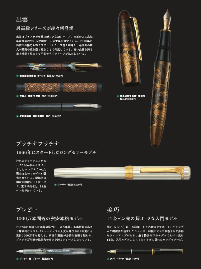 美巧系列:采用美巧尖的白金基础金笔。最低价的款式公价为5000日元(不含税),进阶的有羊皮款、18K金尖款和莳绘款。