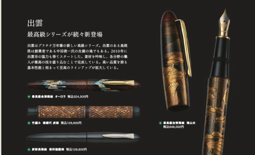 注:出云系列作为白金品牌下最高端的系列产品,巨大的笔身搭配了白金核心的总统尖。最底端的铁刀木,到生漆溜涂。再进阶则采用藤编笔杆,碳粉高莳绘工艺来生产,系列的最高端款采用了加贺莳绘工艺制作。