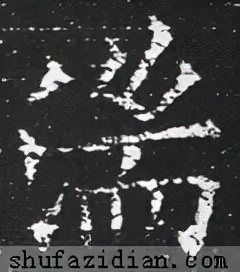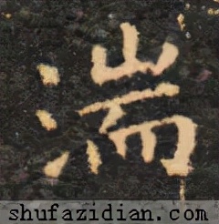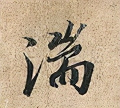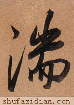 左部“氵”旁整体左斜,要写宽 。首点饱满,收笔向左稍回锋,以引出下一笔;第二点起笔呼应首点,与首点的位置稍近、偏左,收笔向左下出锋,以带出第三点; 第三点距离稍远,呼应第二点收笔,向右下切笔,然后回锋上提,勿重,不要写长,注意指向。
