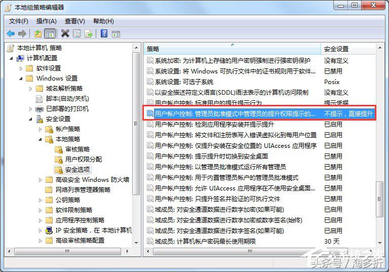 5、点击安全选项时,右边会出现一系列的设置条目。双击右边的用户账户控制:管理员批准模式中管理员的提升权限提示这样一个选项。