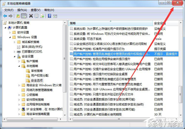 7、最后一步,关闭掉组策略的设置界面退出。这时,如果你再次运行一些未知的程序时,uac就会在后台默默地工作了。