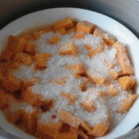 2. 切成1cm的小方,撒上白糖,入高压锅【也可用料理机榨成汁】