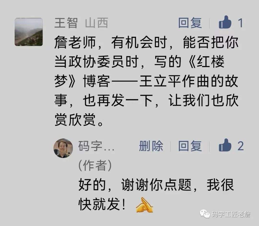 写在前面的话:每年参加两会,一大好处便是可以以平等、轻松的方式,接触各种名人,与他们面对面交谈。尤其吃饭时间,大家都是委员,彼此同坐一桌,自然多了些亲切,少了些戒备。老詹刚进政协,正巧与文化界委员住同一宾馆,每天吃饭,逮住机会,总喜欢同一两个有故事的委员聊聊天,这不,王立平委员就聊起了《红楼梦》作曲背后的故事……