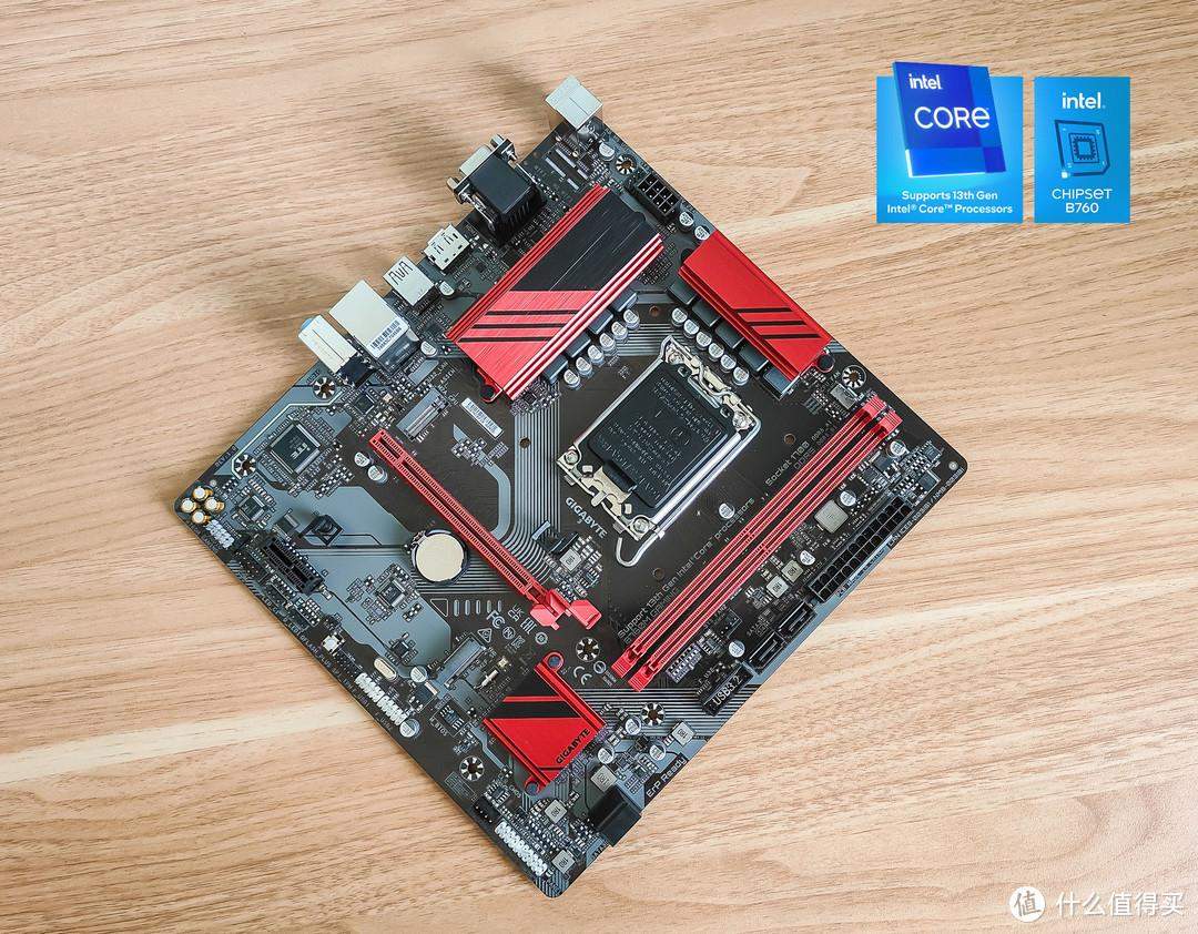 这次对比测试选择的是一款技嘉魔鹰B760M GAMING主板。这款主板底板是传统的黑色,散热片、内存插槽、PCIe插槽等则是醒目的红色,对比强烈,经典的红与黑配色。