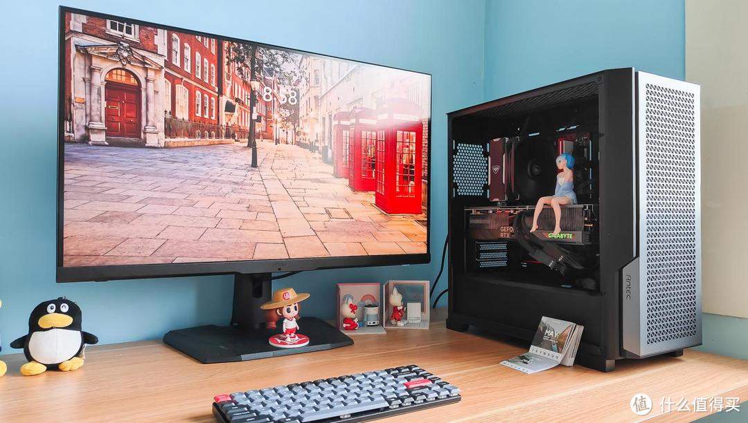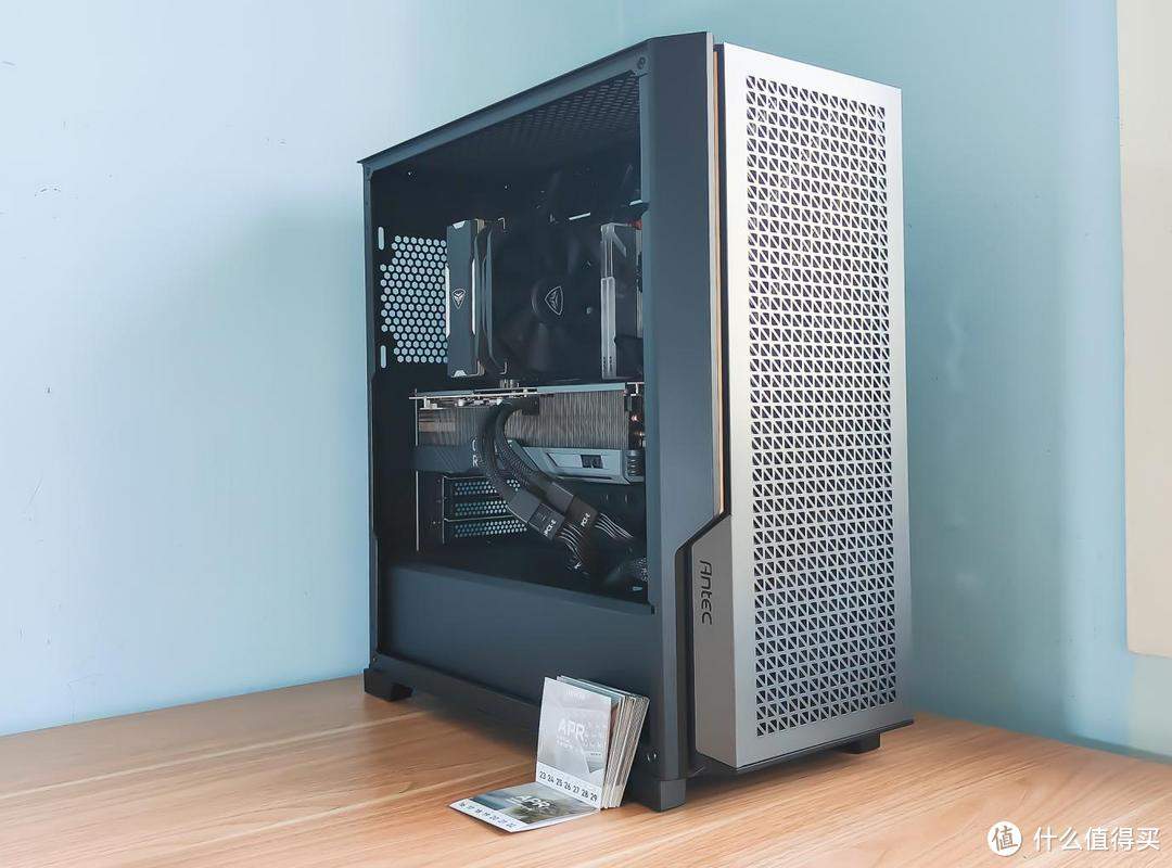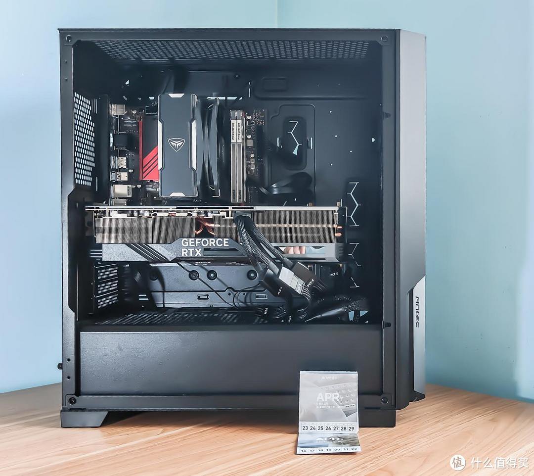 安装完毕,整体看上去还是不错的,非常有型,酷酷的。机箱是安钛克的机箱P20C,这机箱容量很大,支持E-ATX主板,同时可以确保支持40系巨大的显卡身材。它还有内置显卡支架,非常实用。机箱同时支持水平和垂直风道,更有利于散热。