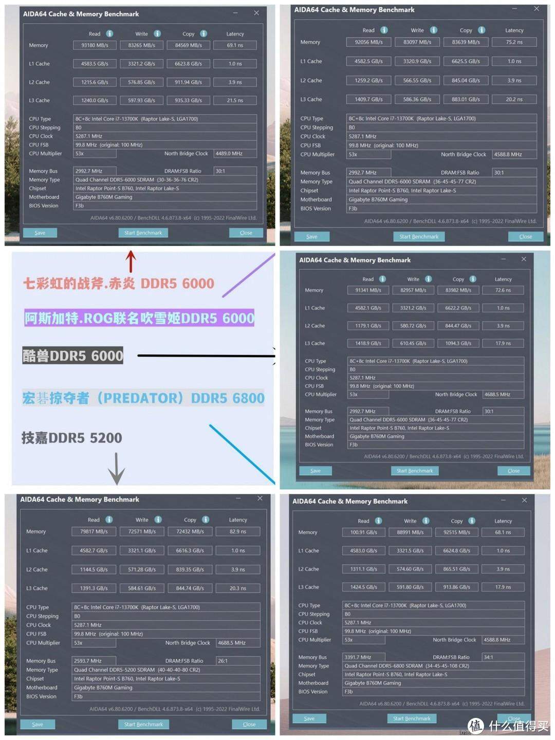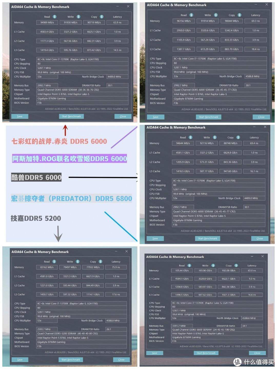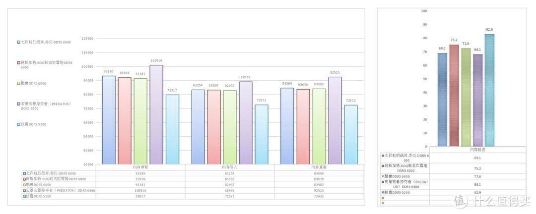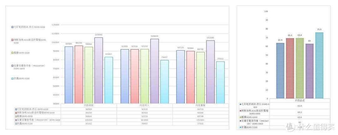 通过图表看得更加清楚,前面3列是开启XMP后6000MHz内存的表现,第四个是6800MHz,第五个是5200MHz。