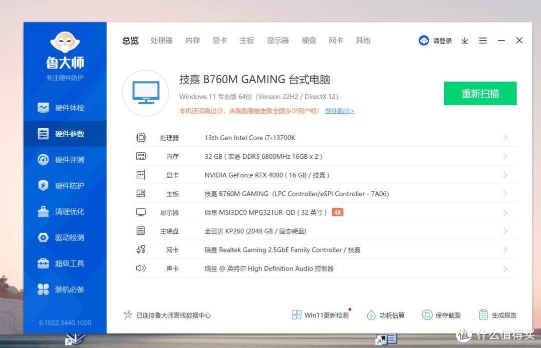 我们来看看这套测试平台的其他配置,CPU是英特尔i7-13700K,显卡是技嘉的RTX 4080,硬盘是金百达的KP260。
