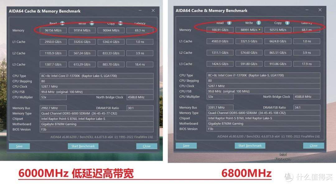那么这种低延迟高带宽的功能,对于性能的提升在于多少幅度呢?我们拿2个数据做个对比,左侧的是内存6000MHz+开启低延迟高带宽功能,右侧是单纯的6800MHz时的表现,比较读写数据,发现是相差无几,各有高低。而延迟上,则是基本一致。所以从这个角度讲,如果是最常见的6000MHz内存开启这个功能后的表现,相当于内存从6000MHz又提升到了6600-6800MHz的效果。