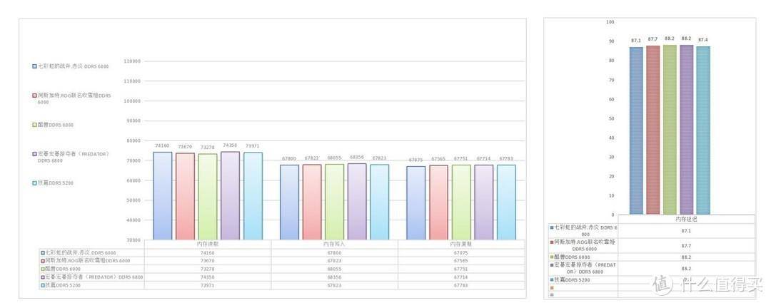 在默频的时候,几款内存,读取在74000MB/s左右,写入在68000MB/s左右,复制在67000MB/s多,而延迟的数据,则是在87-88ns左右。开启XMP后,3款内存提升到了6000MHz,那么他们的读取、写入、复制,分别提高到了92000MB/s,83000MB/s,84000MB/s左右,而延迟同样减少较大,分别是69.1、75.2、72.6ns。而另外两款内存,宏碁掠夺者6800MHz,读写数据更多,分别是100910MB/s,88991MB/s,92515MB/s,提升巨大。而5200MHz的一款早期内存产品,也有提升。