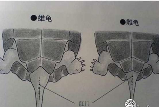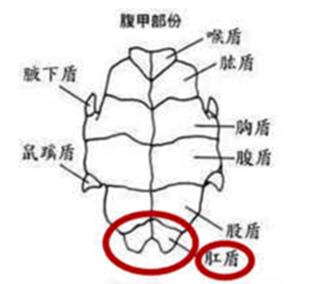 4、肛盾:顾名思义,就是肛门附近的盾片。公龟的肛盾多是外放的,母龟的肛盾是内收的。