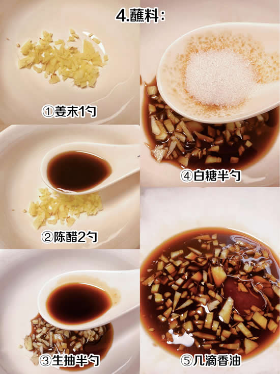 4.蘸料:姜末1勺、陈醋2勺、生抽半勺、白糖半勺、几滴香油。