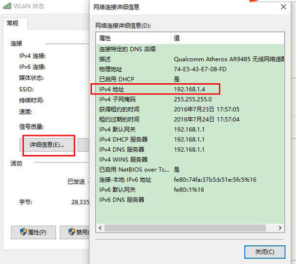 3、点击状态栏中的“详细信息”,可以看到IP地址。