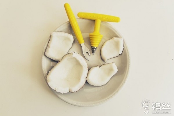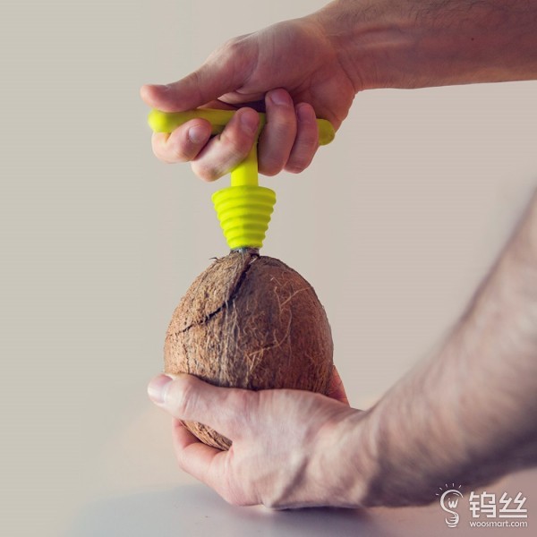 椰子不是有两只“眼睛”吗,拿着这个锥形工具,照着一只“眼睛”往里像拧螺丝一样使劲钻,到一定程度椰子自己就会裂开缝隙,再用另一个长得像扳手的工具撬开就好了。