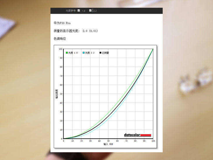 是指屏幕根据显示颜色的变化,多久能做出反应,结合下图黑色曲线是测量到的结果,黑色曲线越接近蓝色曲线说明响应速度越快。华为P30 Pro的这块屏幕成绩在理想范围内。