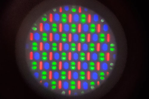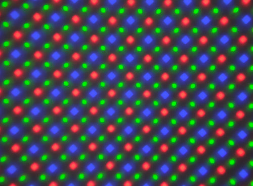 下面我们可以看到华为P30 Pro屏幕的像素排列方式,与普通的RGB三色子像素排列相似又稍有不同,更像Delta排列的改版。通过下图可以发现绿色子像素从一个变为两个,与三星的钻石排列一样,都少了1/3的RGB,等效ppi比率与三星同为81.6%。计算屏幕ppi高于理论上视网膜分辨率的250ppi,与iPhone XR的326ppi一致,与三星同宽屏幕比也并不低。但从排列方式上可以发现,在文字显示竖直笔画时可以完美呈现,在横排就可能出现模糊的情况。显示效果不出色也可能是次像素渲染与主动色彩管理没优化完全导致的。