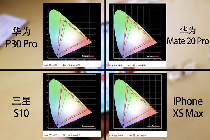 ?P30 Pro这块来自京东方的屏幕能够100%完整覆盖sRGB,并能覆盖84%AdobeRGB色域,约合71.4%NTSC色域。几款对比机型的默认色彩模式色域覆盖范围如下:华为Mate20 Pro拥有94%AdobeRGB色域,约合89.3%NTSC色域、三星S10覆盖的色域最广,达到了97% AdobeRGB色域,约合92.15%NTSC色域,小米9的色域范围也支持到了94% AdobyRGB。从图中也可以发现,华为P30 Pro在绿色显示覆盖的面积要少一些。