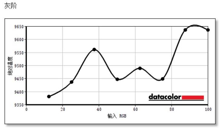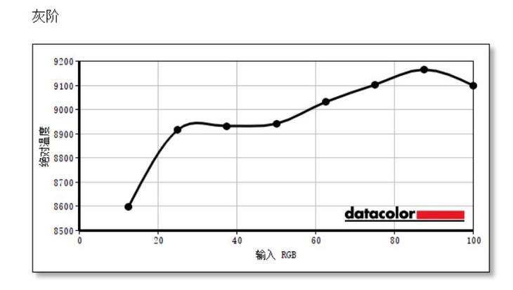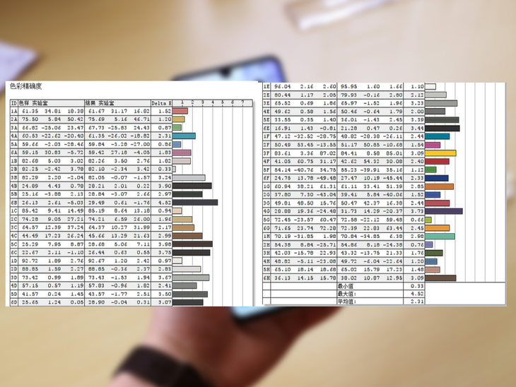 这项也就是我们常说的色准测试了。通过软件让屏幕显示48种特定颜色,显示的颜色由仪器接收并于默认信息进行比对,最终就得出了屏幕的测才准确度。在图表中柱状越短的表示色彩显示越准确。其中最小值为0.33,最大值为4.52,平均值为2.31,不算优秀但在正常水平。