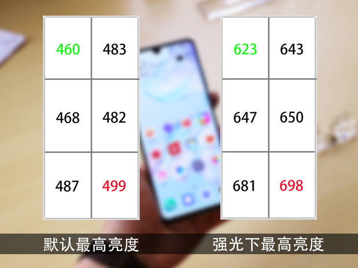 屏幕最高亮度将直接影响使用中的显示效果,经过测试华为P30 Pro的屏幕默认最高亮度达到了499nit,平均最高亮度为480nit这一成绩要好于此前测试的多款机型。使用手电筒照射光线传感器激发强光下最高亮度,平均最高亮度为657,同样也是个非常优秀的成绩。在户外使用根本不用担心因强光照射导致屏幕显示不清。