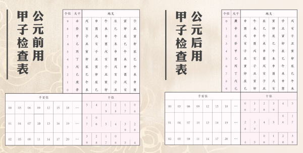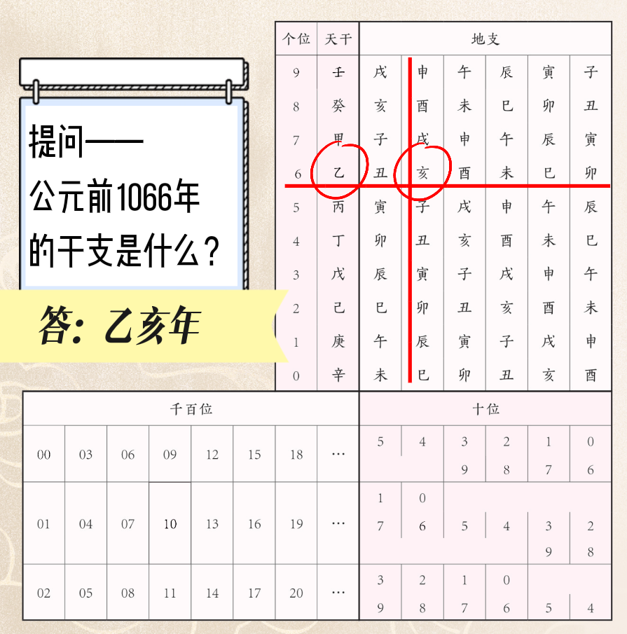 先看第一个。上面两个表格是天干地支,下面两个和侧面这条是公元的数字。比如我们要找公元前1066年的干支,首先找到1066的千百位是10,接着横向对应过去找到十位数6,再纵向往上看这一列,找到个位数是6的那一行,一行一列相交之处,就能直接读出干支了。所以公元前1066年就是乙亥年。
