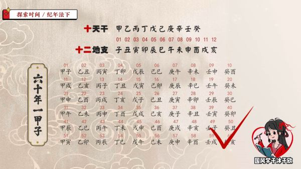 再回到开头的问题,地支纪年前怎么还有个天干呢?是的,单凭地支纪年其实已经能够均匀连续地一直记下去了,可问题是,每过十二年就会有一个同样的年份,这周期对于一个人的一生来说都很短暂,更不用说用来记录漫长的历史了。但如果能再搭配上十天干,组成六十年一循环,这就大大拉长了时间线,大体上也可以记录完古人的整趟人生旅程。
