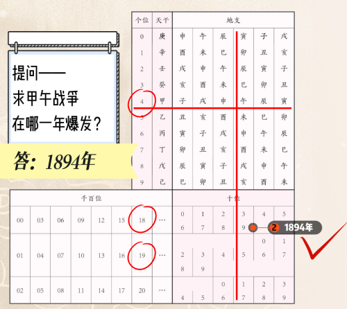 反着推算也类似,只不过每个干支对应的年份有好多,要想推出具体年份就需要有些参照。比如我们查甲午战争是哪一年爆发的,这就要用公元后的表格。先找到甲午这一行,对应个位数是4,再确定一下千百位,既然这是近代发生的事,那么不是18几几年,就是19几几年,由此就可以锁定三个答案,1834年、1894年和1954年。最后再用我们的近代史常识就能确定,甲午战争一定发生在1894年。