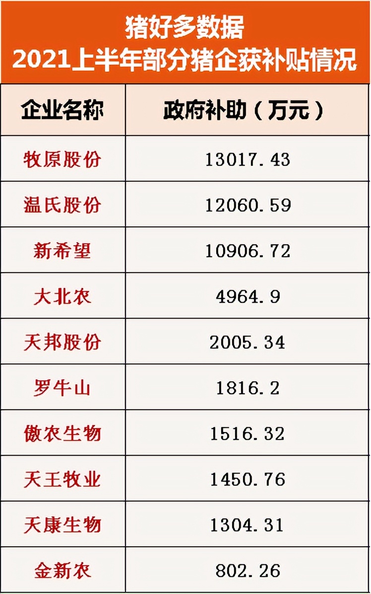 我们先来看看一些头部猪企每年能拿到国家多少补贴?据统计: