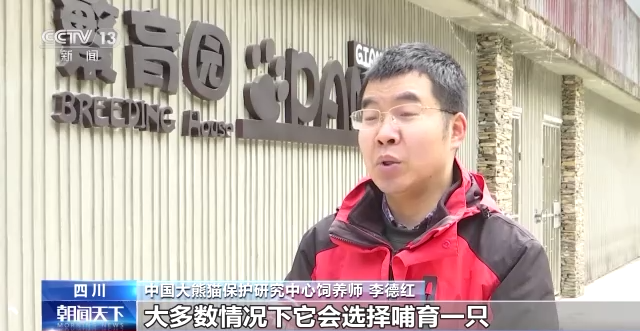 中国大熊猫保护研究中心饲养师 李德红:大熊猫在生了双胞胎之后,大多数情况下会选择哺育一只。主要因素就是严苛的生存环境,以及它自身的身体状态,比如它乳汁分泌不足,可能不足以支撑它哺育两只幼崽。