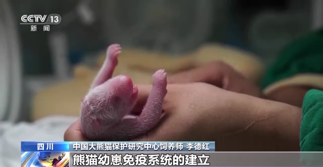中国大熊猫保护研究中心饲养师 李德红:圈养大熊猫在生产的时候,我们的工作人员在旁边随时待命,如果它生了双胞胎的话,我们会将其中的一只取出来进行人工哺育。但熊猫幼崽免疫系统的建立是必不可少的,我们会采集熊猫母亲的母乳到育儿室进行哺育。