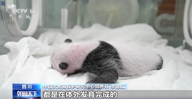 中国大熊猫保护研究中心饲养师李德红:它的各个器官大部分都是在体外发育完成的。比如它的视力要40天左右才会发育好,听力要两个月左右才能发育好。