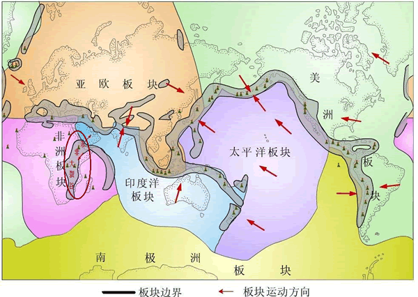 板块构造学说是解释地表宏观地形的主要学说,该学说的主要观点包括全球的岩石圈可以分为六大板块,分别是亚欧板块、非洲板块、印度洋板块、太平洋板块、美洲板块和南极洲板块,板块内部相对稳定,而板块与板块之间的边界地壳运动活跃,板块的边界通常可以分为板块相互碰撞挤压的消亡边界,以及板块相互分离张裂的生长边界。