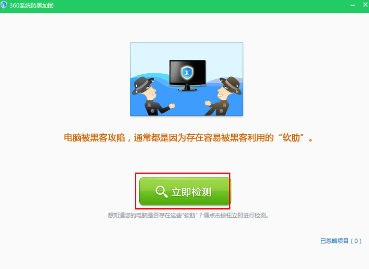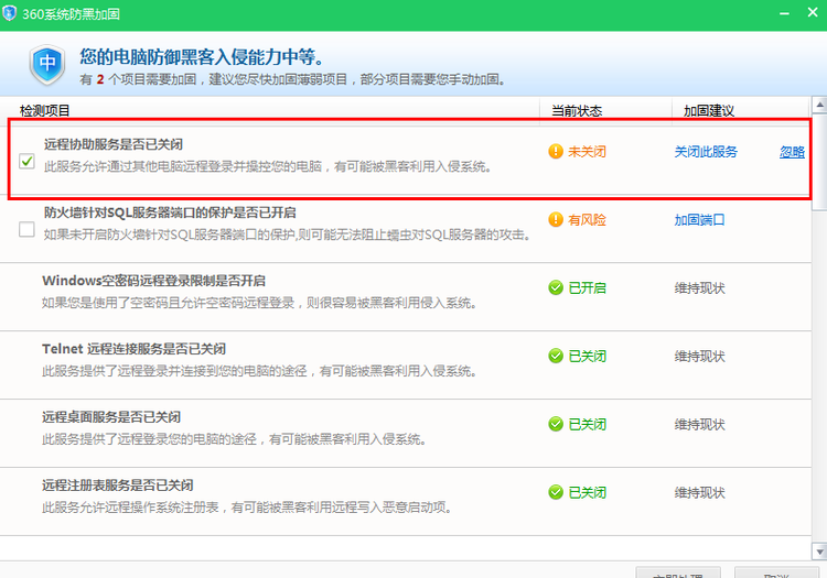 4.点击立即检测,这时候软件就会检测出系统目前存在的问题,具体可以通过检测结果看出来。然后就根据当前的状态以及加固建议,对问题进行处理。