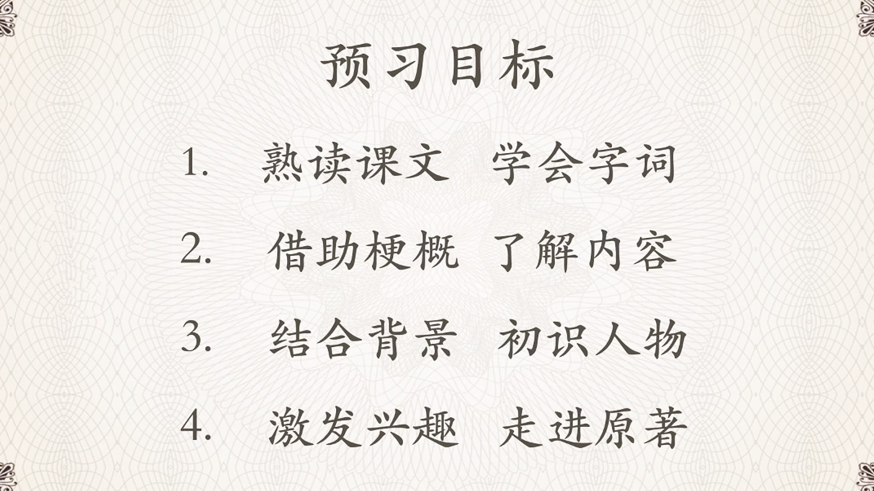 了解了什么是梗概,那么本课的预习目标有哪些呢?大家记住这四点:熟读课文、学会字词;借助梗概、来了解主要内容;结合创作背景、初识人物;激发学生的阅读兴趣、走进名著。