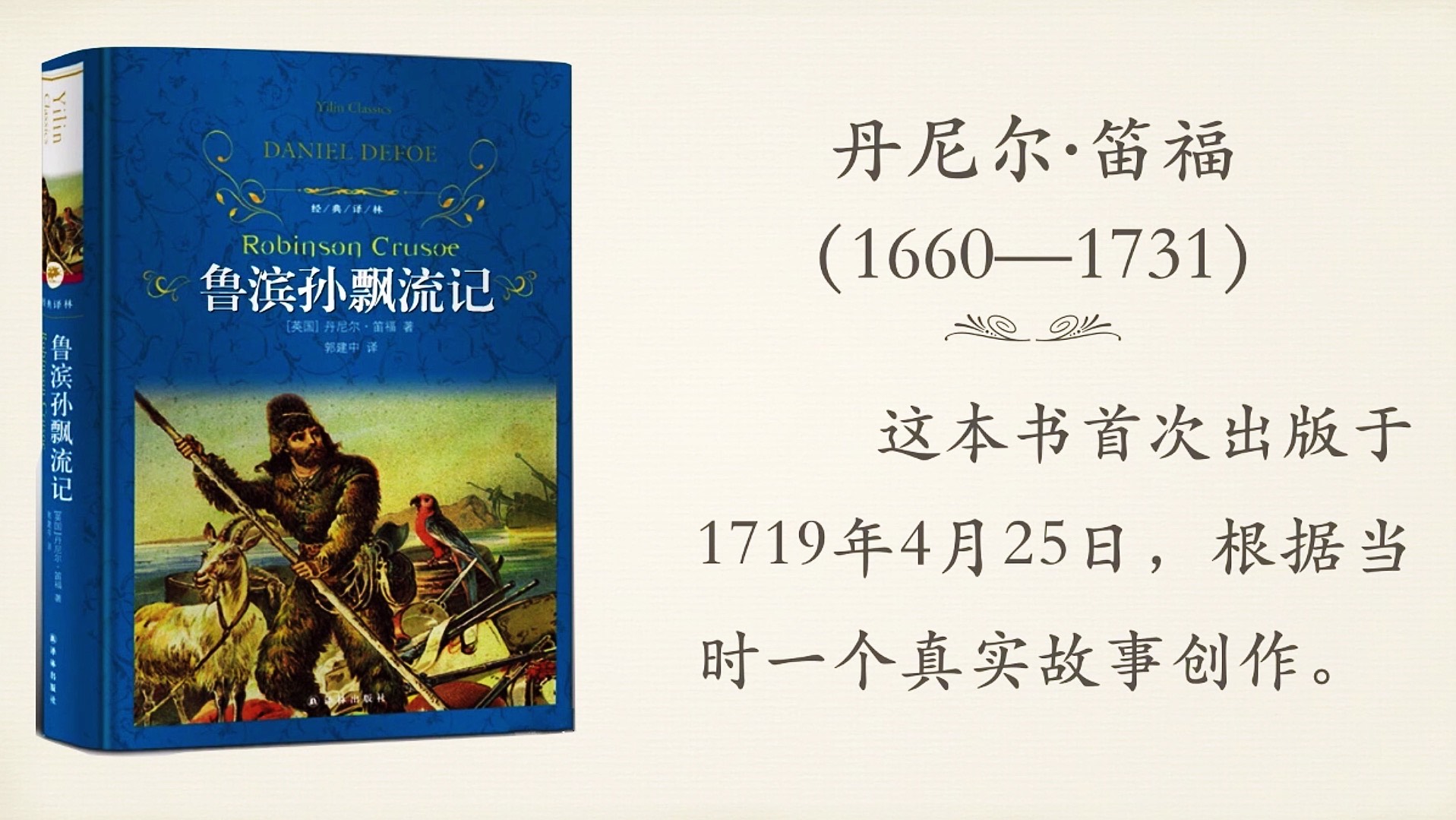 同学们,背景可以是书的写作背景、人物的背景、时代的背景等等,下面我们来看这本书,它第一次出版于1719年4月25日,根据当时的一个真实的故事创作出来的。