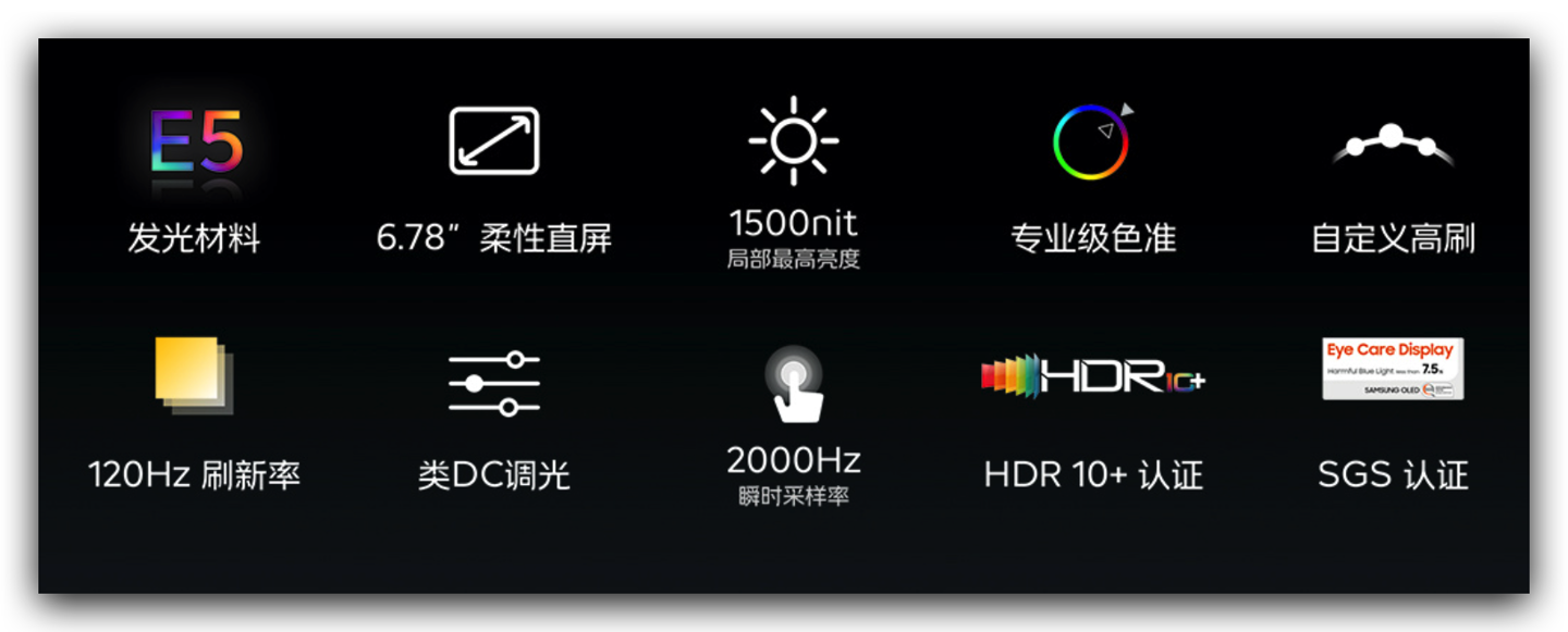 屏幕分辨率为 2400×1080,支持 120Hz 和四档变速 ,屏幕局部峰值亮度:1500nit,支持 HDR10+ 。