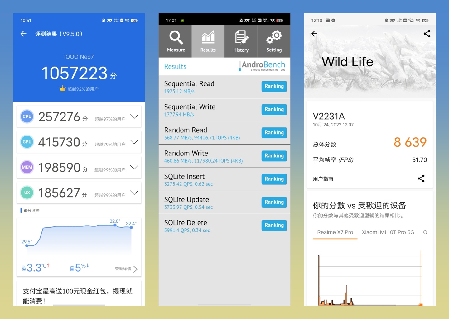 更侧重 GPU 理论性能的 3D Mark,在 Wild Life 测试项目中,iQOO Neo7 总分 8639,其中平均帧率为 51.70fps,略低于骁龙 8+,但这个成绩也是安卓机的第一梯队表现了;